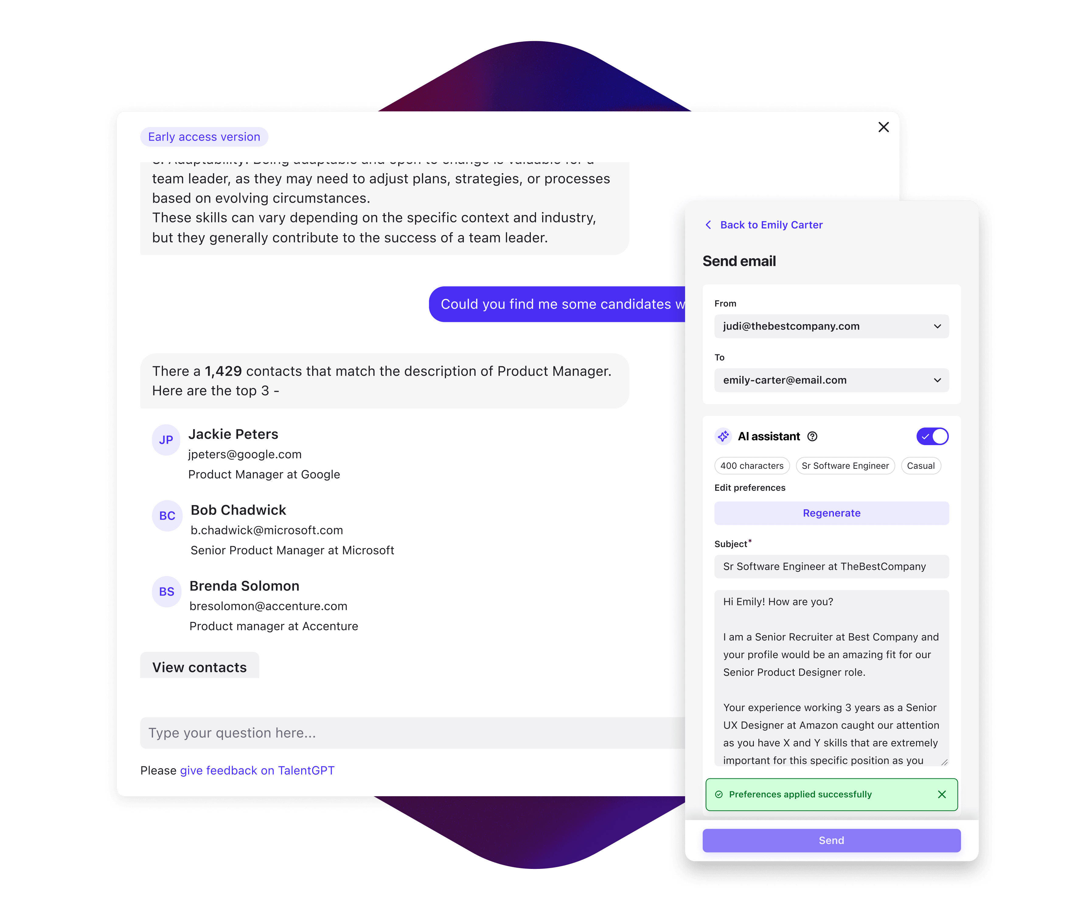 Leverage insights powered by Beamery’s AI and GPT-4 to generate job descriptions (with skills the organization lacks), provide contextualized email templates to the ideal candidate audience, and guide employees towards the skills they need for their next promotion… and much, much more.